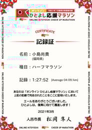 March 2021 "Hitoyoshi Marathon" (half marathon category) 7th/402 runners (1:27:52)