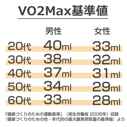 (Kojima) According to "Reference Values of Maximal Oxygen Intake by Gender and Age for Health Promotion" included in "Exercise Standards for Health Promotion" (Ministry of Health, Labor and Welfare, 2006), the reference values of VO2Max by generation and age are 40 ml for men and 33 ml for women in their 20s, 38 ml for men and 32 ml for women in their 30s In their 40s, men are 37 ml and women are 31 ml; in their 50s, men are 34 ml and women are 29 ml; and in their 60s, men are 33 ml and women are 28 ml.